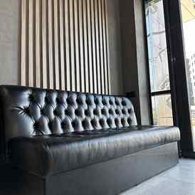 Большая часть интерьера барбершопа выполнена из древесины, что придает атмосфере индивидуальность и особый уют. Все элементы интерьера и декора в здесь изготовлены вручную с использованием экологически чистых материалов: дерева и металла.